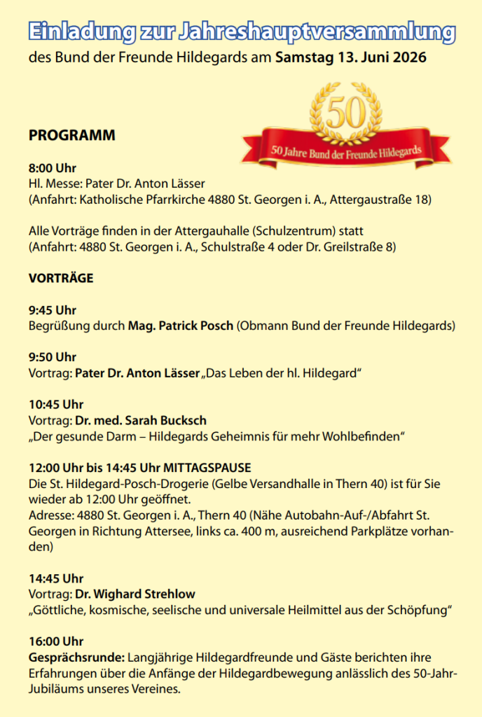 Herzlich Willkommen beim „Bund der Freunde Hildegards“ dem ersten Hildegard von Bingen – Verein, der länderübergreifend über die Gesundheitslehre der heiligen Hildegard von Bingen regelmäßig berichtet – seit seinem Gründungsjahr 1976.